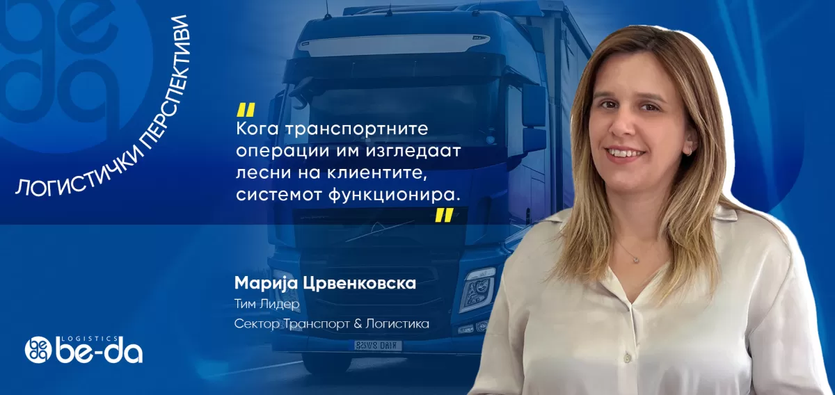Во БЕ-ДА Логистик, 2025 година се покажа како клучна преку перспективата на оперативното лидерство на Марија Црвенковска, Тим лидер во секторот транспорт и логистика, од нашата канцеларија во Скопје. Работејќи секојдневно со оперативните тимови, транспортните партнери и клиентите, нејзиното искуство покажува дека долгорочната стабилност во логистиката се гради преку силно тимско лидерство, дисциплинирана извршна реализација и доследна оперативна усогласеност низ целиот транспортен синџир.